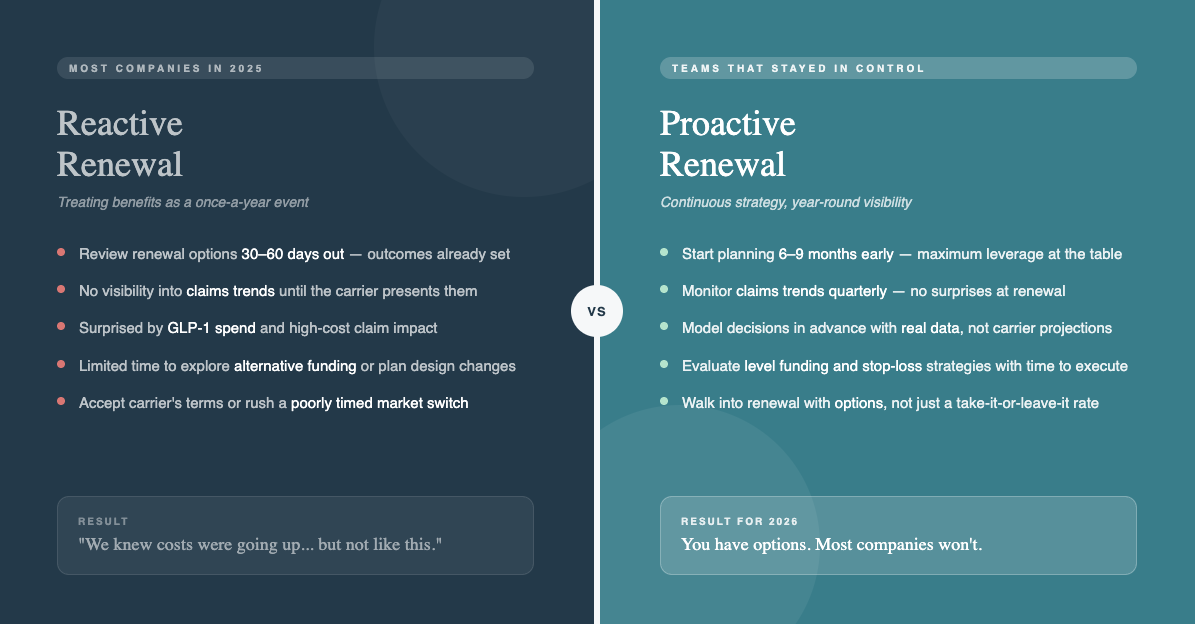 The real issue is structural. Most companies still treat renewal as a once-a-year event. By the time options are reviewed, outcomes are largely set. The teams that felt more in control approached things differently. They started earlier, monitored claims trends, modeled decisions in advance 📊, and explored alternative funding strategies.