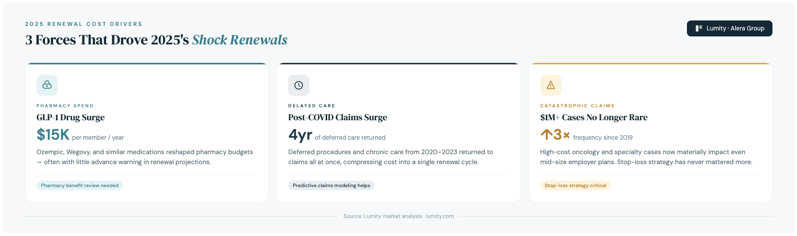 The biggest drivers were consistent across the market. GLP-1 medications like Ozempic and Wegovy rapidly reshaped pharmacy spend, often exceeding $10,000-$15,000 per member annually 💊. Delayed care from the COVID era returned all at once 🏥. High-cost claims—especially $1M+ oncology and specialty cases—are no longer rare ⚠️.